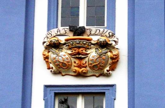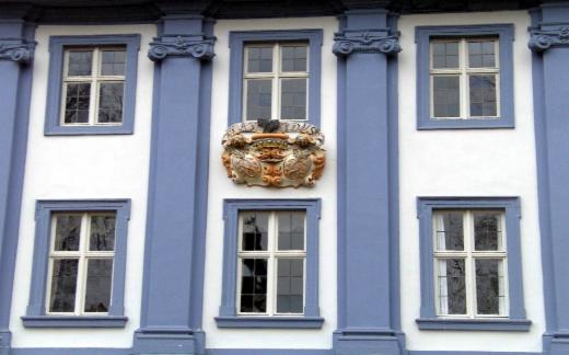 Das Allianzwappen an der Ostseite des Blauen Schlosses bezeichnet die Auftraggeber Phillip Albrecht und Johanna Dorothea v. Seckendorff und das Baudatum 1711 .