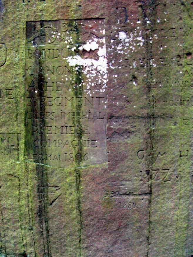 Kunstvoll im Stein verewigt, die Gedenktafel für einen französischen Kanonier vom 2. Mai 1806.